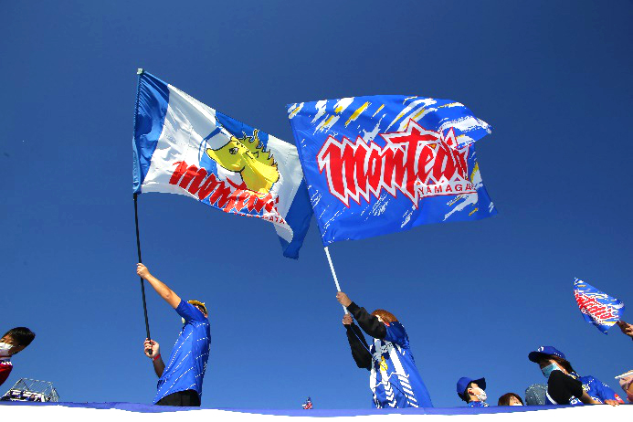 選手入場時や得点時にフラッグ、ニットマフラーを使って、ともにホームの雰囲気を創り上げましょう!選手への後押しをお願いします。