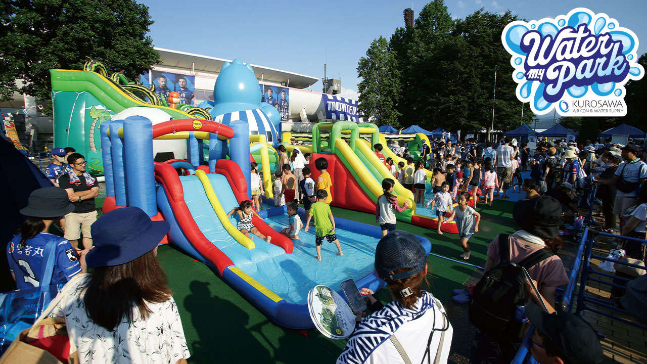 スタジアムに水遊び広場が登場!こども達に大好評の床噴水や20M超大型ウォータースライダーで思いきり遊びつくそう!