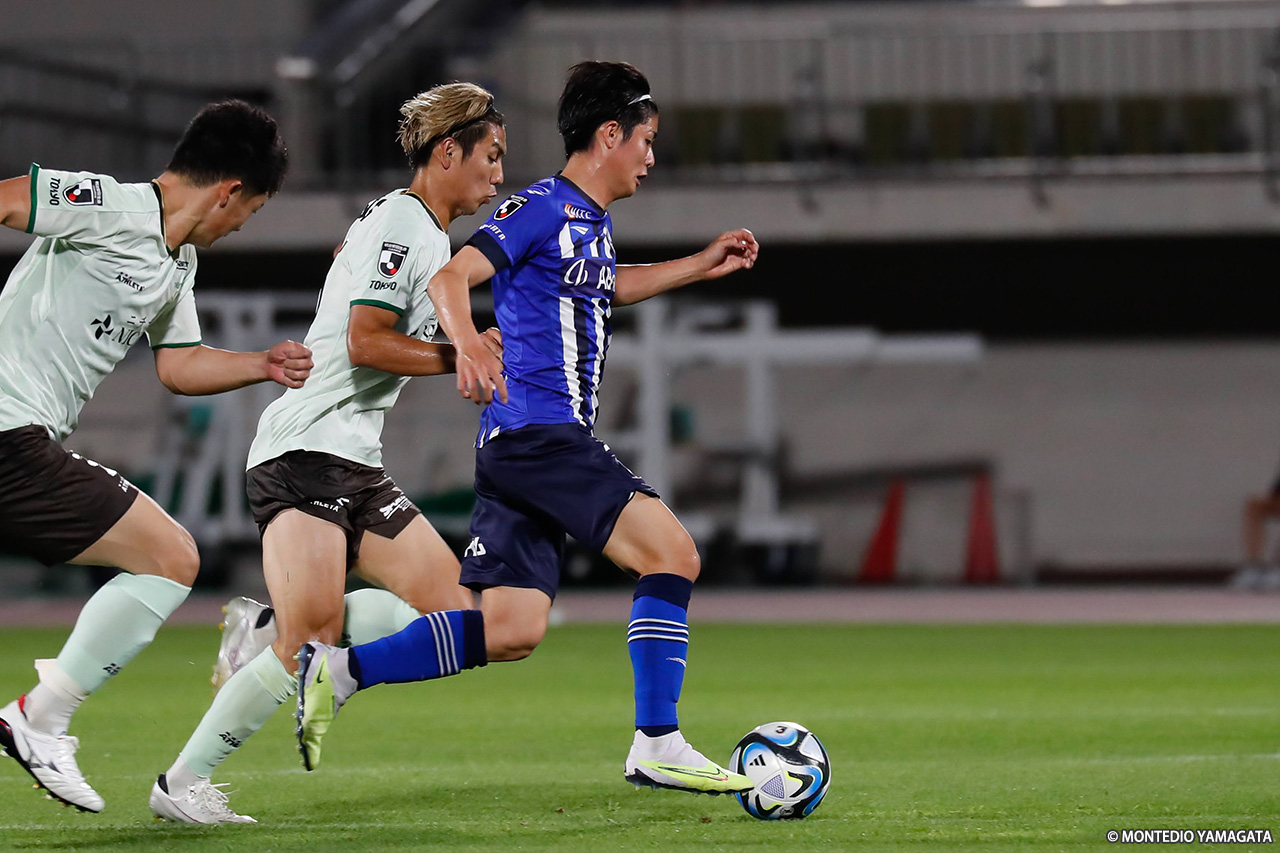 試合は東京Vが序盤からボールを動かし、左サイドからのクロスでモンテディオゴールに迫ると、6分、モンテディオのビルドアップのミスから東京Vがショートウンター。左サイドに開いた山田剛綺のクロスをファーサイドで齋藤功佑に頭で決められた。