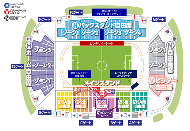 ※メインスタンドSS++指定席、SS+指定席・SS指定席・S南指定席・グループシート・SA南自由席・自由南席がニュートラルエリア(上記図「N」)となり、ビジターチームを応援されるお客様も、ビジターチームユニフォーム着用での観戦が可能です。
