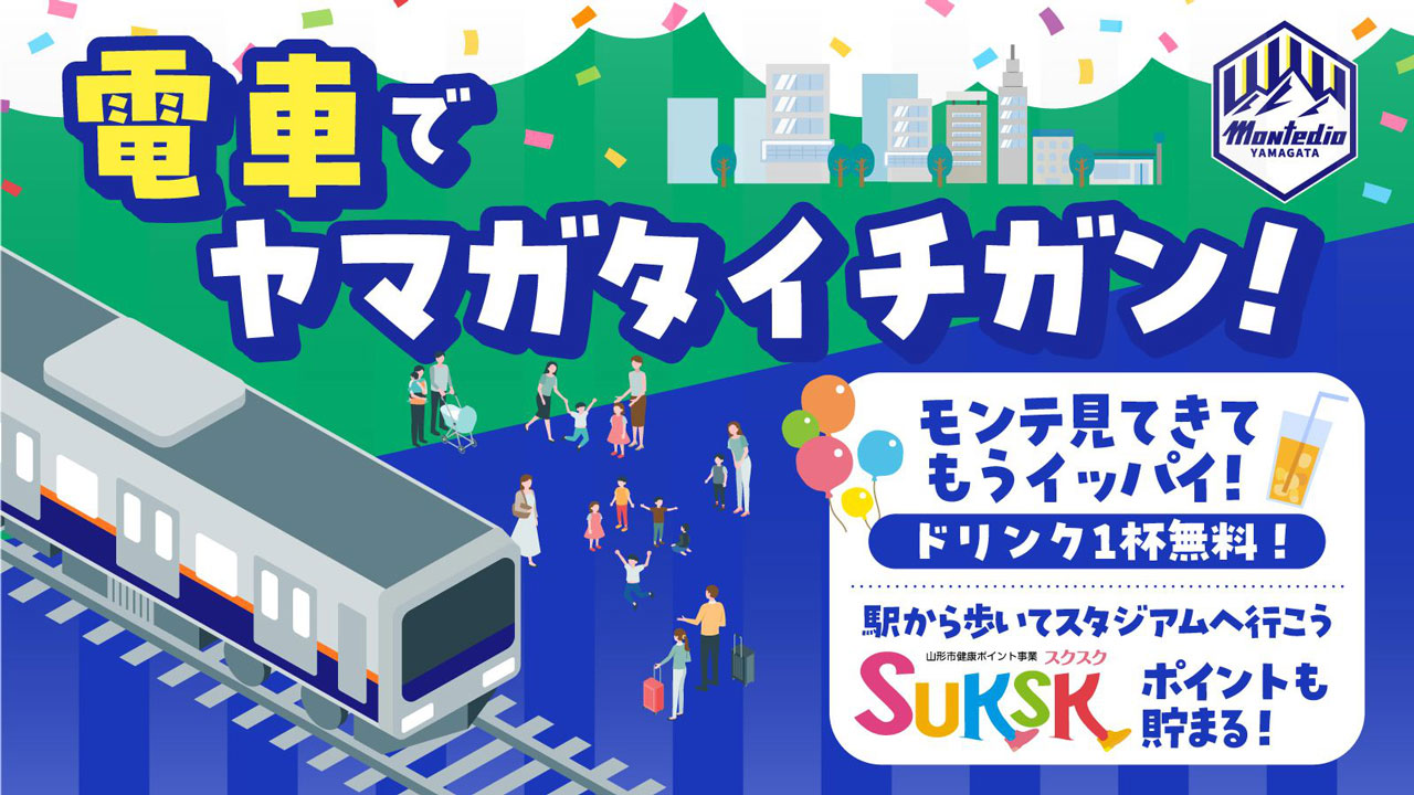 モンテディオ山形では、山形市役所と共に、地方課題である公共交通機関の利用者減・中心市街地のにぎわいが失われていることに対し、電車利用・飲食店利用を促す、機運醸成企画をホームゲーム全試合で実施いたします。