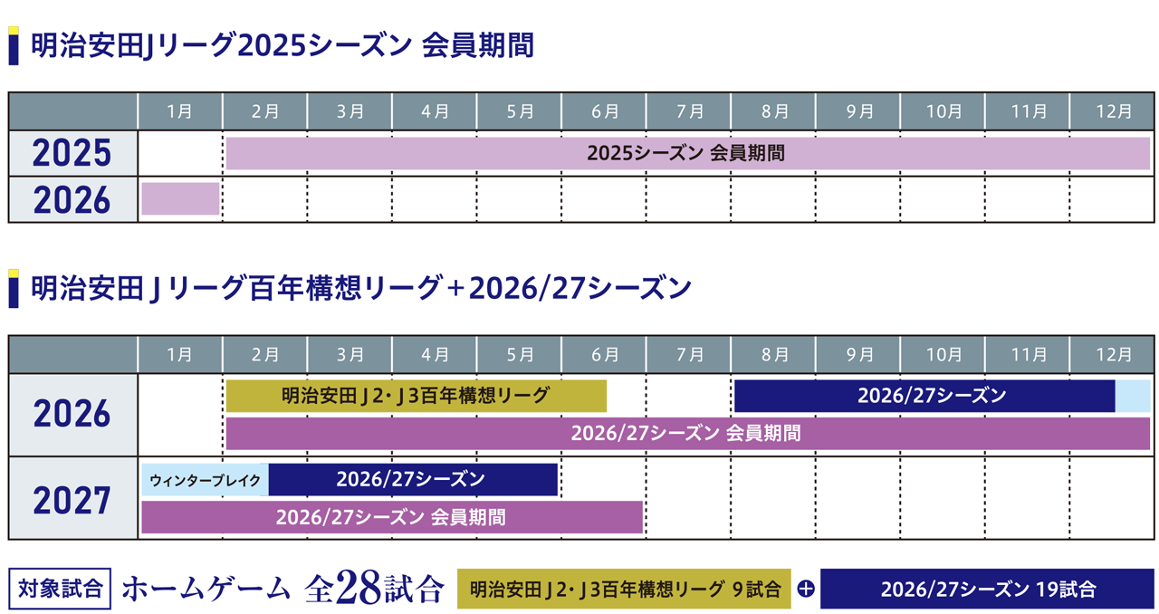 ◆Jリーグのシーズン移行 [春秋制→秋春制] に対応するため、移行年度のみ会員期間を [1年→1年5か月]に調整します。