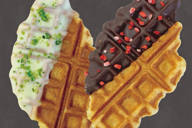 クロワッサンの生地をワッフルの型で挟んで焼きました。チョコ×ドライイチゴ/ホワイト×ピスタチオ どちらも最高な組み合わせです!