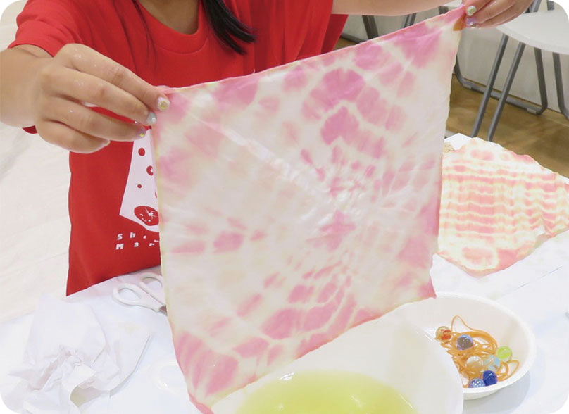 選手サイン入りのハンカチに紅染め体験ができるのは今日だけ!どんな模様になるかは、完成してからのお楽しみ!