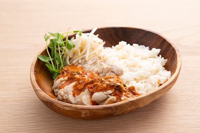 お出汁が染み込んだライスに蒸し鶏をのせ、自家製怪味ソースをたっぷりかけたカオマンガイです