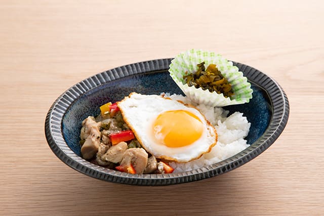 自家栽培のオリジナルハーブと青唐辛子がアクセントのタイ風ガパオライス♪当店の一番人気商品です!!