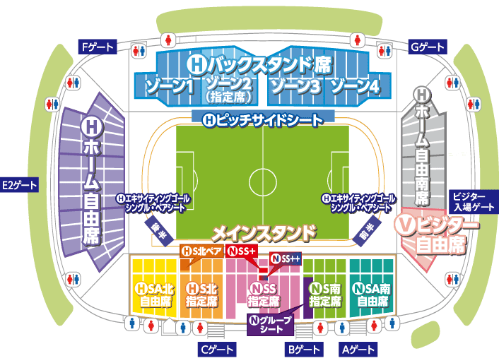 メインスタンドのビジターよりの全座席指定のシートです。ビジタークラブのウォーミングアップやハーフタイム時に引き返す選手を間近で見ることができ、毎試合違った雰囲気を味わうことができます。メインスタンドの入場ゲート・再入場ゲートにも近く、試合直前までゆっくりと場外でのお食事や各種イベントをお楽しみいただけます。