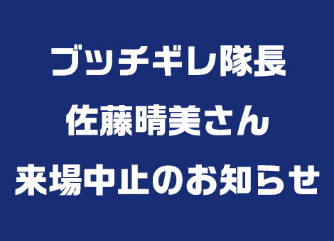 仙台戦で予定しておりましたブッチギレ隊長佐藤晴美さん来場について、体調不良により中止とさせていただきます。楽しみにしてくださっていた皆様には、ご迷惑をおかけして誠に申し訳ございません。 ご理解のほど、何卒よろしくお願い致します。