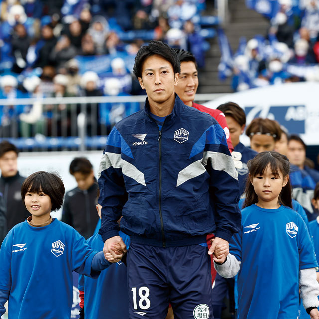 試合前にエンブレムフラッグを持って入場いただきます。入場後、ホームチーム側ピッチの中央にフラッグを掲げていただき、入場してくる選手をお出迎えいただきます。