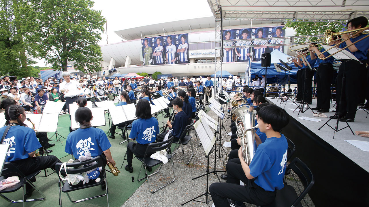 県内中学校高校のブラスバンドがスタジアム全体を盛り上げます!場外ステージでは、各ブラスバンドのパフォーマンス披露・ハーフタイムには合奏!