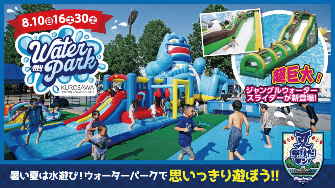 スタジアムに水遊び広場が登場!こども達に大好評の床噴水や20M超大型ウォータースライダーで思いきり遊びつくそう!