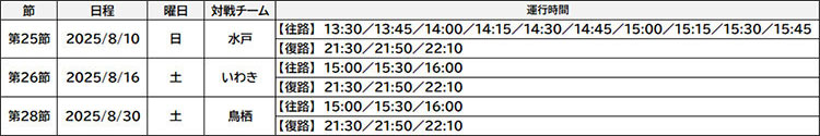 - 各試合によって運行時間が異なりますので予めご確認をお願いいたします。