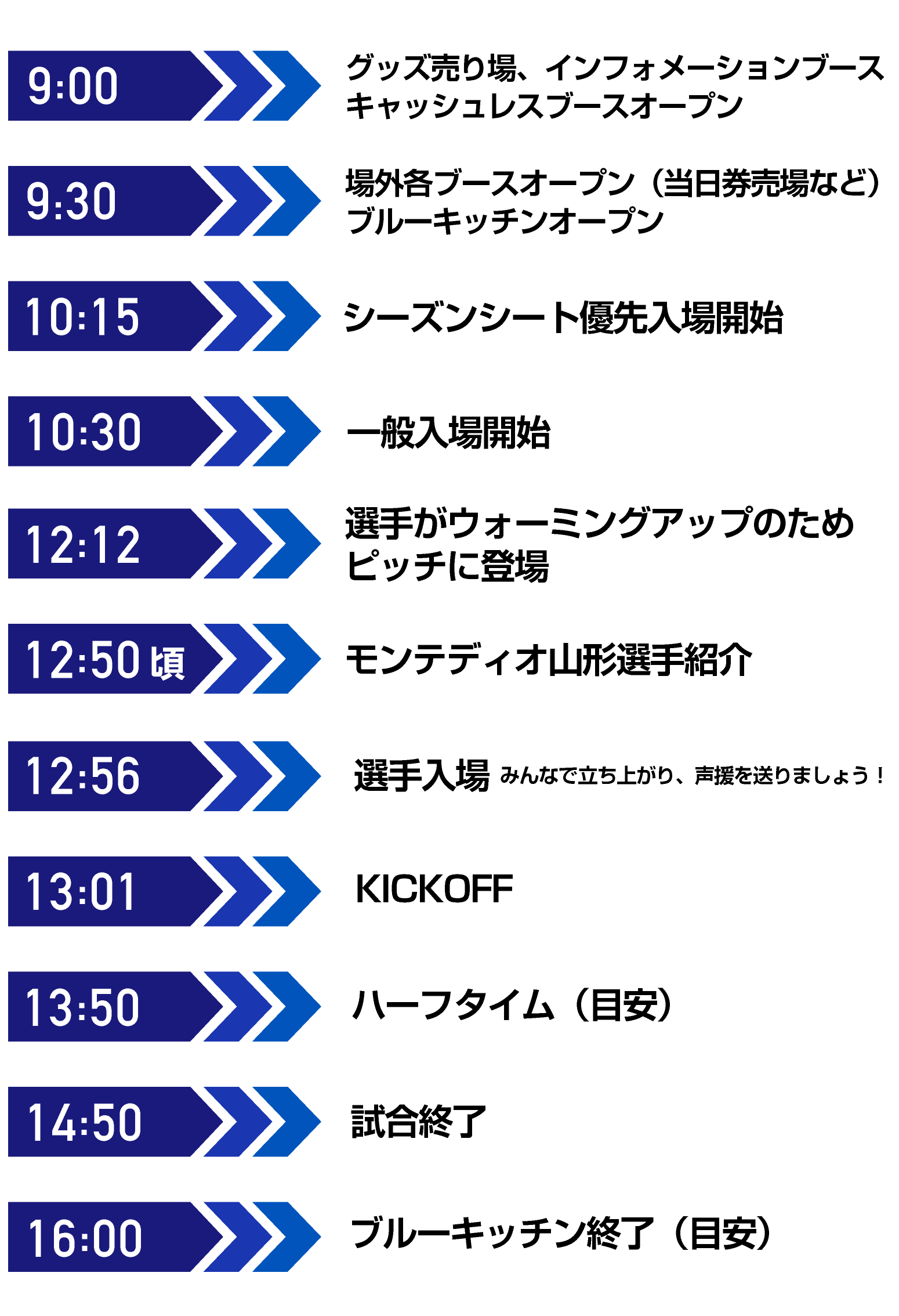 - 場外飲食売店【ブルーキッチン】は試合終了後も1時間営業を行っております。ご利用いただきながら、分散退場にご協力ください。