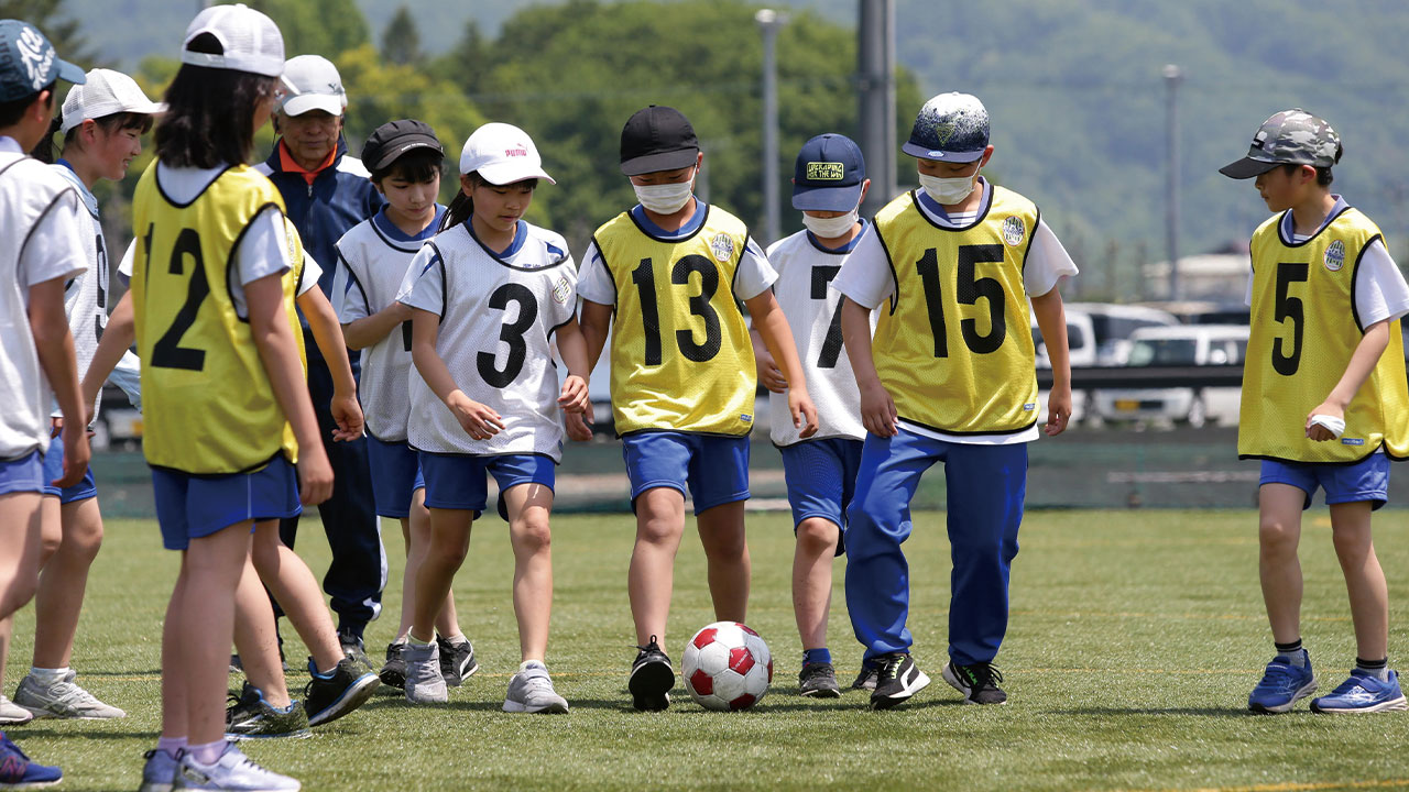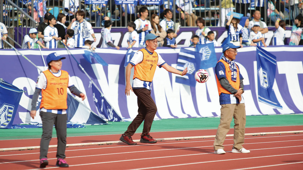 フィールド内で試合開始を待つ両チーム選手に対し、センターサークルに向けてボールを蹴り入れるセレモニーです。