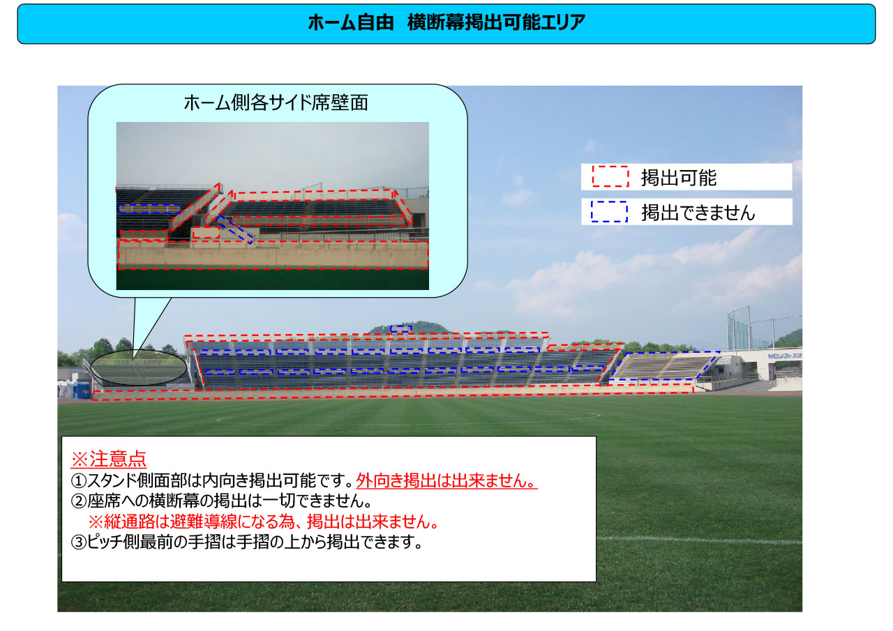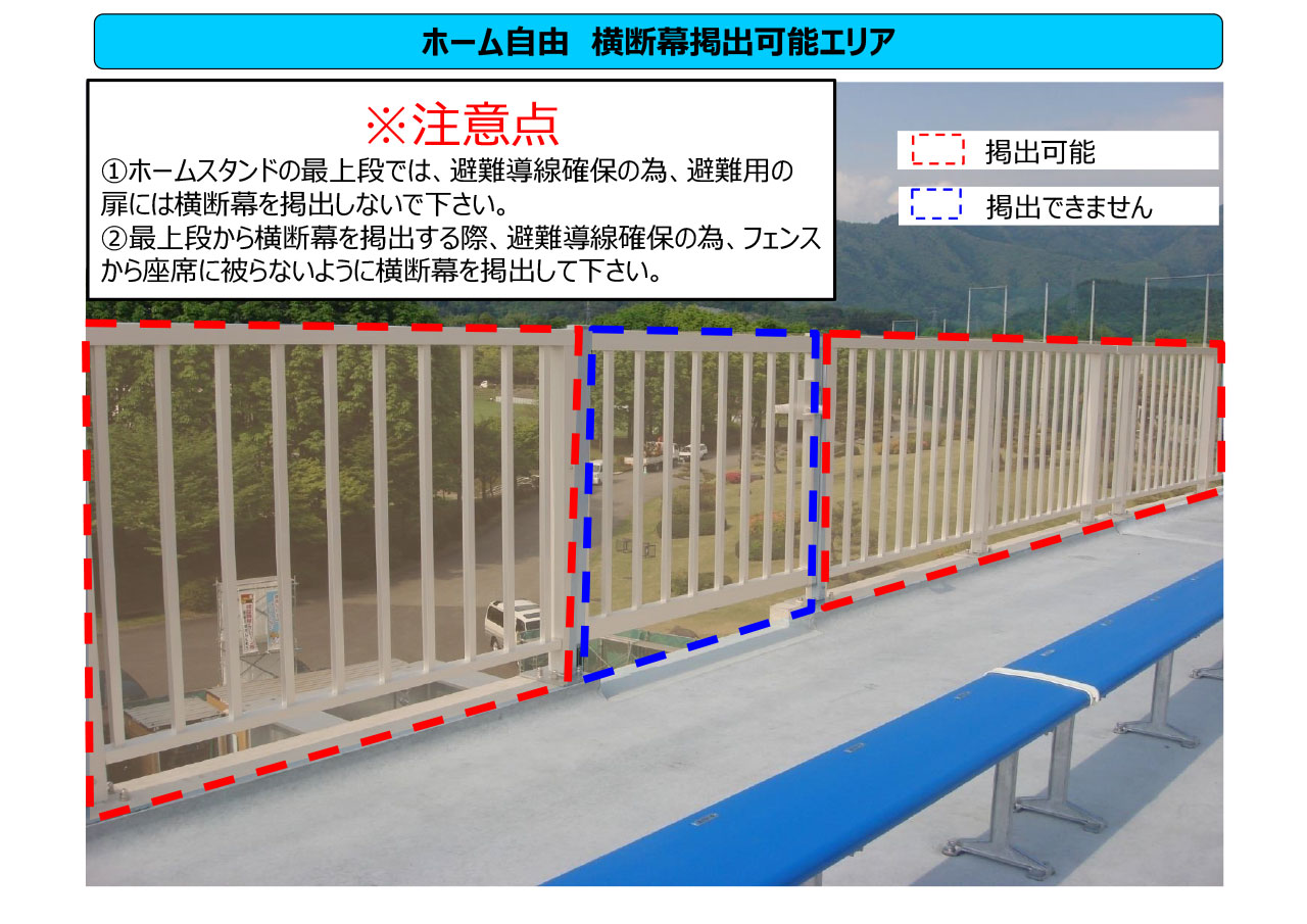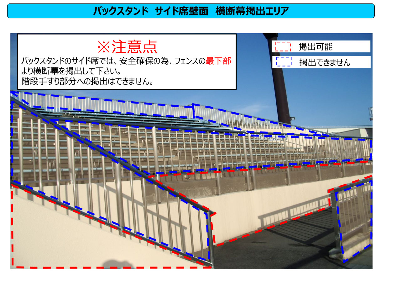 誹謗中傷を目的とした横断幕等主催者が認めている以外の特定の会社名・商品名・企業の宣伝になる横断幕の掲出を禁止しています。(※試合運営管理規定に基づく)