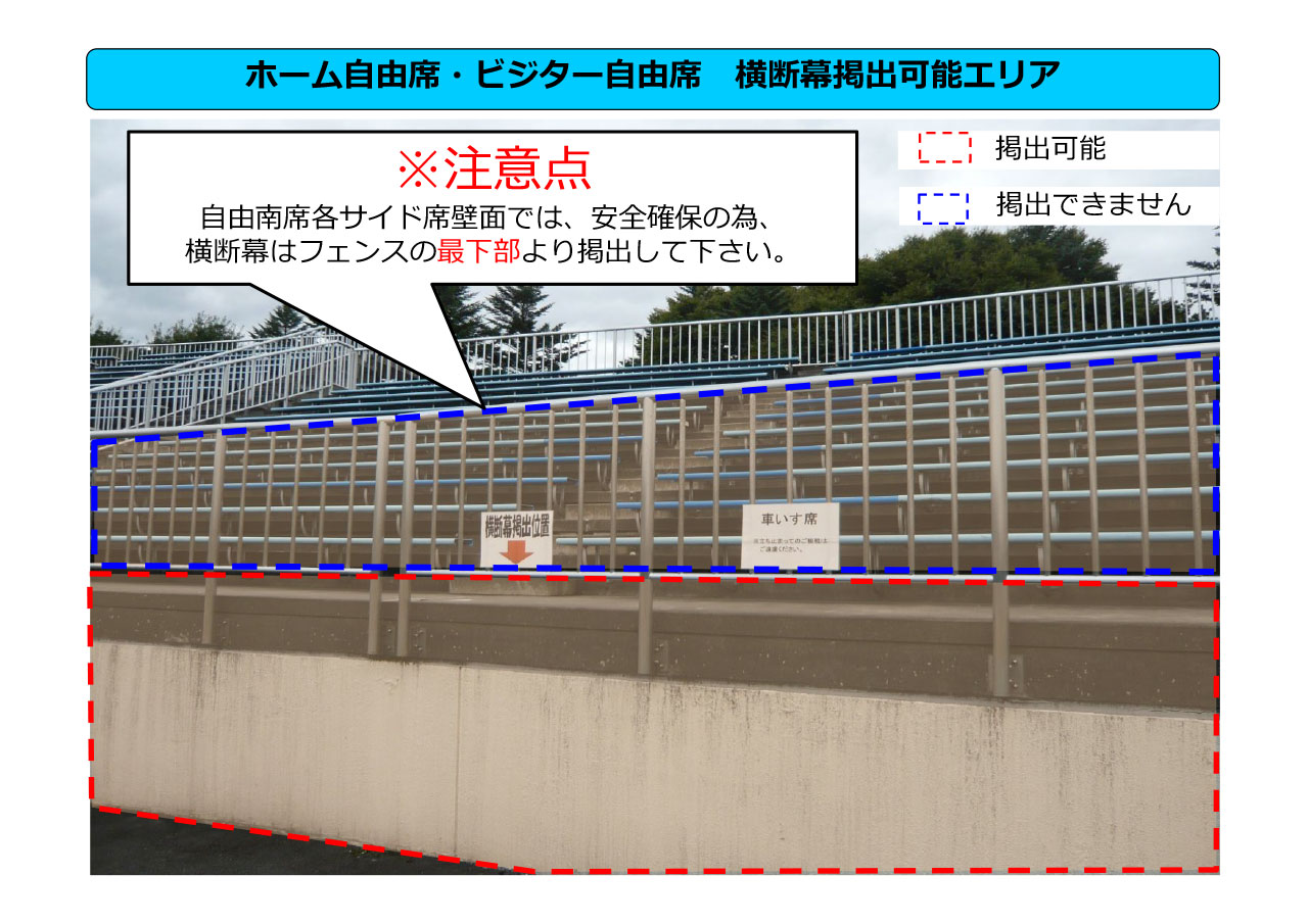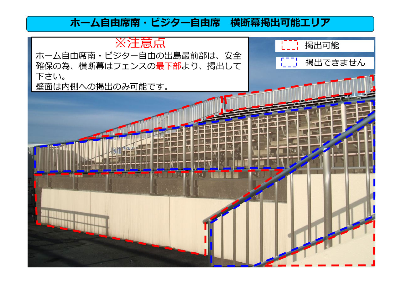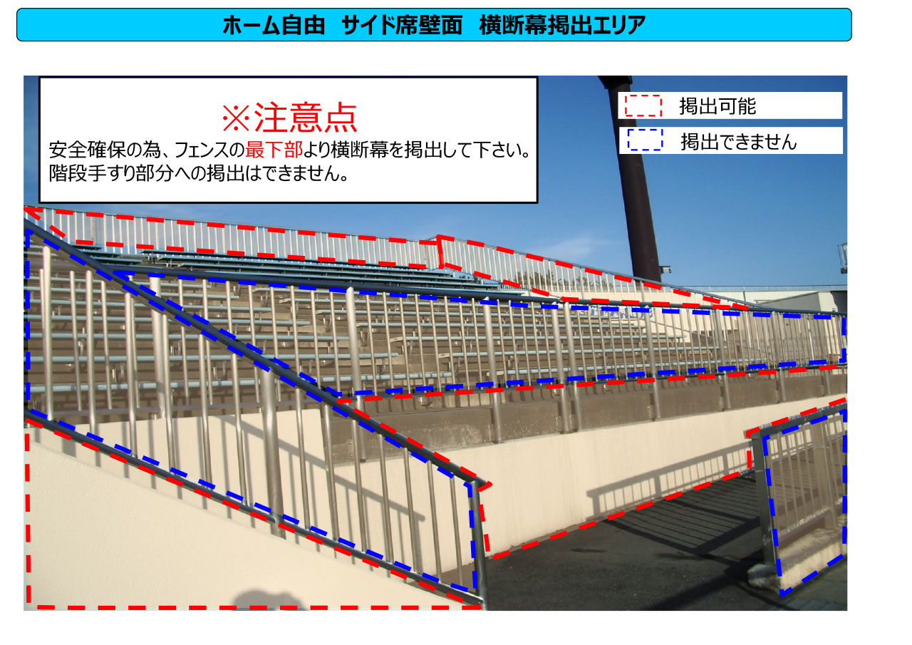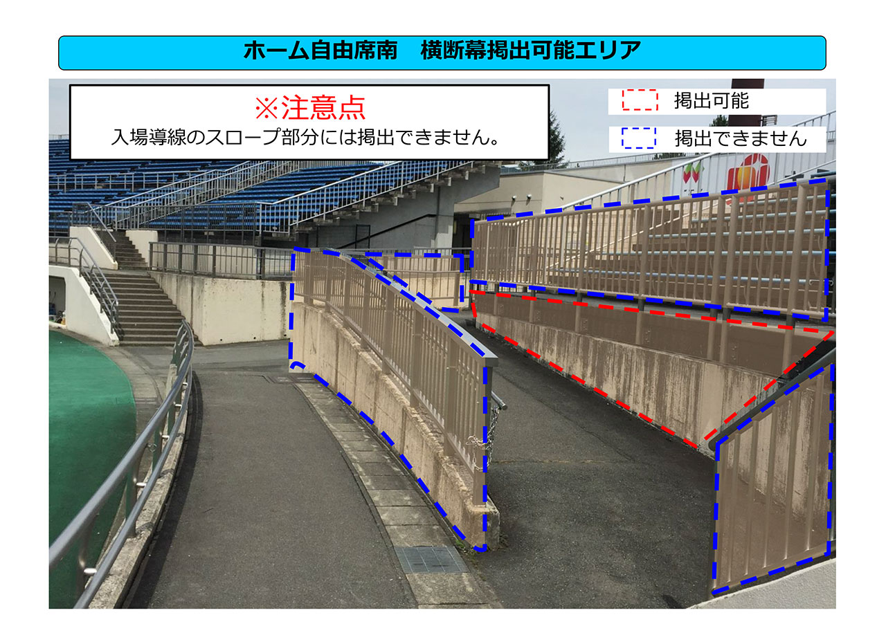 一般入場の1時間前から35分前までの間、横断幕の事前掲出が可能です。事前掲出をご希望の方は時間までにFゲートにお集まりください。ホーム側の横断幕掲出可能エリアすべてに掲出が可能です
