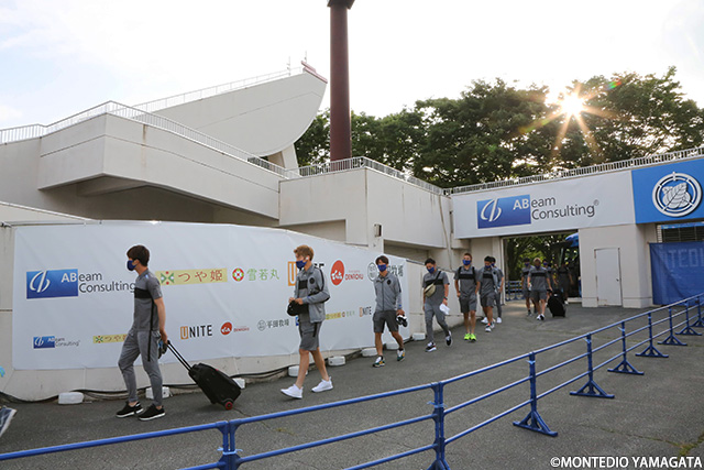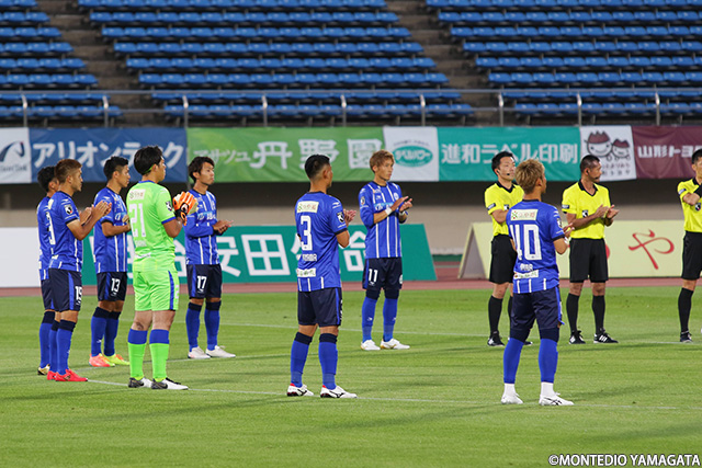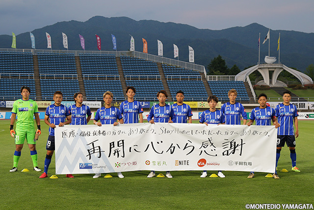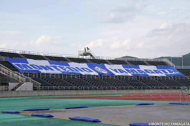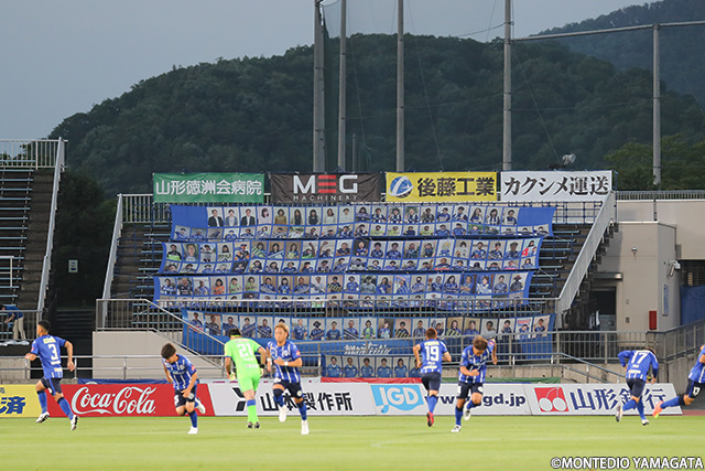 2月23日の開幕戦以来、さまざまな困難を乗り越えて開催されることになった第2節・栃木戦はリモートマッチ。サポーターの方々は入場できなかったが、ホーム側出島にはフラッグサポーターの横断幕が掲示され、大型ビジョンにはサポーターから寄せられた応援動画が映し出された。また、試合に入ればサポーターの声援を模したサウンドステッカーが場面や状況ごとに使い分けられた。通常の開催に可能な限り近づけるそうした工夫や努力もあり、試合は無事行われ、モンテディオ山形は1-0で勝利した。