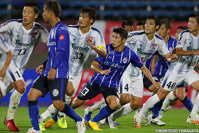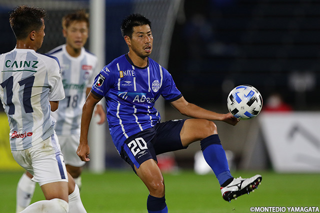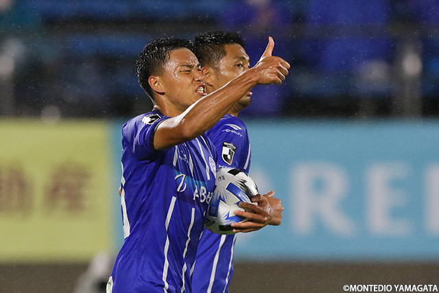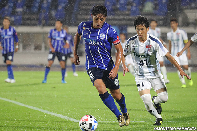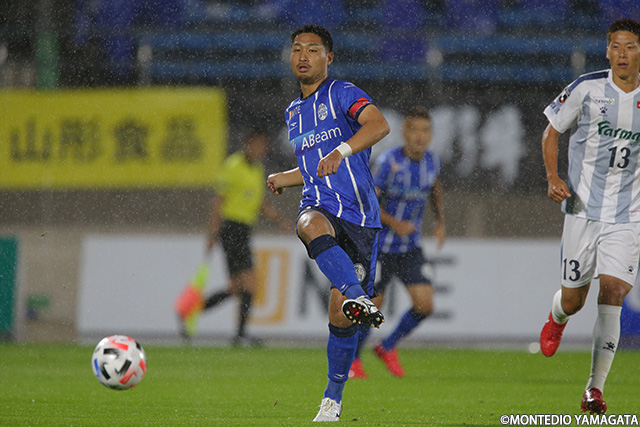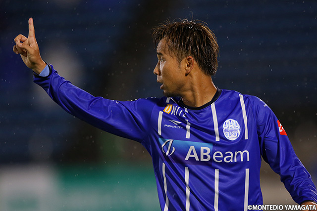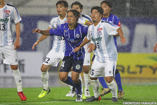 反撃を続けるモンテディオは35分、松本怜大選手の縦のフィードに加藤選手が走り込み、マイナスのクロスに飛び込んできたのは中村充孝選手。バウンド直後のボールを右足で合わせ、1点を返した。しかし、41分には左サイドを群馬に突破され、岩上祐三選手のクロスに進昂平選手にヘディングで合わされて、再度2点差に離された。