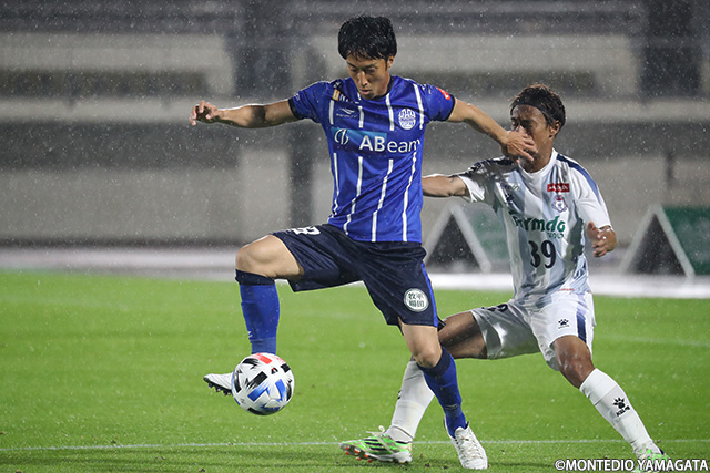 モンテディオは立ち上がりから左サイドで中村駿選手、加藤大樹選手が上下動を繰り返し、2分には渡邊凌磨選手を追い越した中村駿選手がクロスを上げた。15分には中村充選手のサイドチェンジを受け、三鬼選手のクロスに大槻周平選手が合わせたが、グラウンダーのシュートはわずかに枠をそれた。