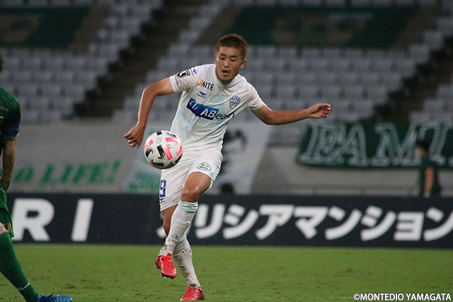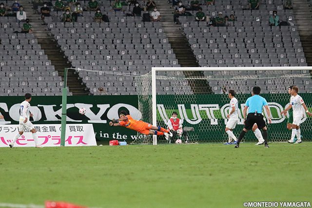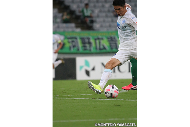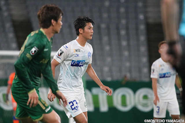 開始直後からモンテディオは相手センターバックにもプレッシャーをかけるハイプレスを敢行。東京Vが足元でパスをつなげば、すかさずアプローチをかけて蓋をした。左サイドでは東京V・藤本寛也選手に小野田選手がアプローチをかけたが、時にはパスカットからクロスに持ち込み、山田選手のシュートにつながる11分のシーンも作った。しかしその直後、ボールロストからカウンターを受ける。井上潮音選手のシュートが強烈にポストを叩き、跳ね返りを端戸仁選手に押し込まれたが、ここは戻った栗山直樹選手がクリアした。