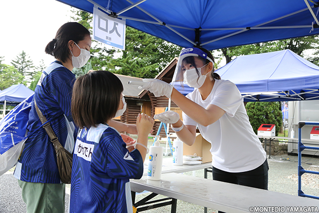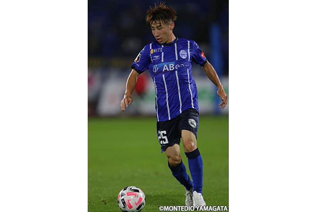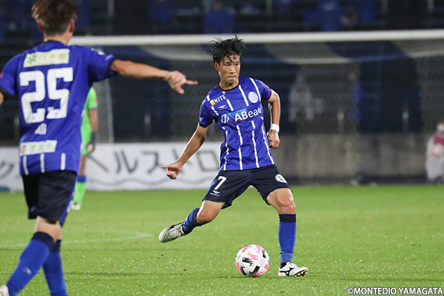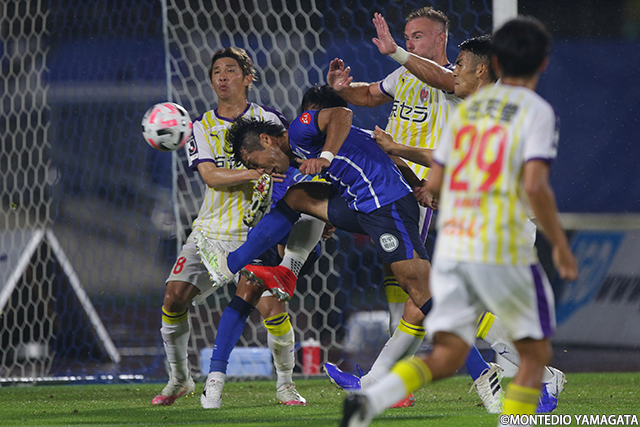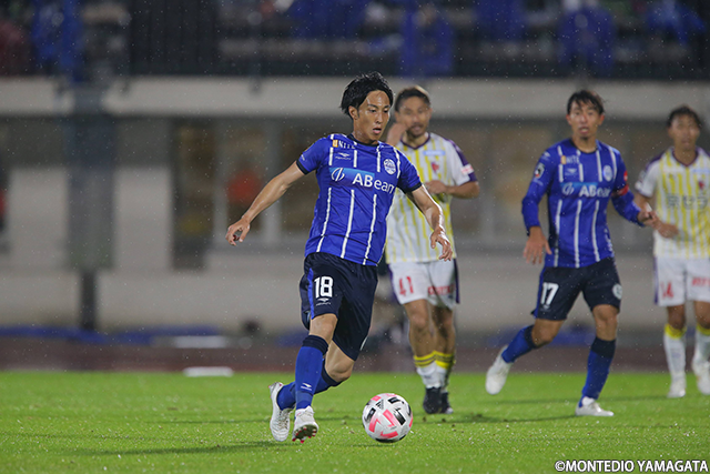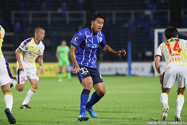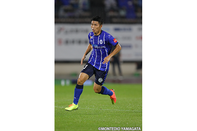 1週間の準備感を経て、モンテディオ山形は前節後半に実践した4-4-2のフォーメーションでスタートした。相手の攻撃の起点となるアンカー・庄司悦大選手は、縦関係の2トップ・山岸祐也選手がマーク。また、右サイドバックに回った山田拓巳選手は、相手の左ウィングバック・荒木大吾選手とのマッチアップで特長を封じた。