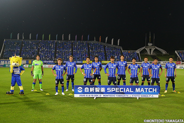試合はフォーメーションを変えたモンテディオに京都が戸惑い、さらにモンテディオもこれまで以上に前へプレーすることで多くのチャンスを作っていった。3分には大槻周平選手の落としから山岸祐也選手がミドルシュート。4分には左サイドハーフ・末吉塁選手のクロスに山岸がシュート。11分にはペナルティーエリア内で大槻選手がポストプレーからさらに攻め込み、最後は山田拓巳選手がミドルシュートを放った。
