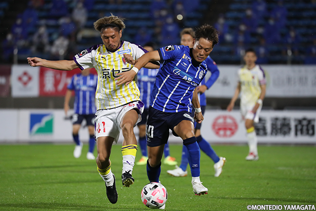 モンテディオは再び高い位置からプレッシャーをかけ始めたが、37分、京都・安藤選手に末吉選手がアプローチすると、末吉選手とうまくはさみ込んだ大槻選手がボールを奪取。その直後、大槻選手の体に安藤選手の手がかかったがノーファウル。その隙も突く形で、中野克哉選手からロングフィードが送られるとウタカ選手は裏へ抜け出しながら胸で正確にトラップ。冷静に流し込んで京都が逆転。