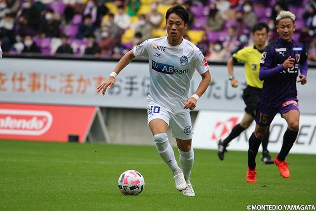 立ち上がりから、互いにボールを持つ時間を作りながら、守備では厳しく対応する締まった展開。モンテディオは8分、FKからヴィニシウス アラウージョ選手の頭に合わせたり、9分には松本怜大選手のパスに加藤大樹選手が飛び出したが、クロスが相手の守備に阻まれるなど、効果的な攻撃にならなかった。