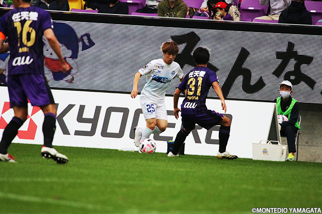 逆に京都はシャドーの仙頭啓矢選手が左サイドでボールを受け、戻りながら背後にパスを送ったり、ミドルシュートを放ったりと存在感を強めていた。モンテディオも渡邊凌磨選手のミドルシュートや、南秀仁選手のクロスなどもあったが、全体的にコンパクトさを保てず、いつものテンポのいいボール回しや守備への早い切り替えは影を潜めていた。