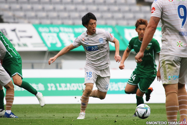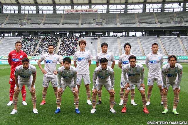 モンテディオの先発は前節から二人変更。ボランチの藤田息吹選手から國分伸太郎選手へと、右サイドハーフ・中村充孝選手から中原輝選手へ。堀米勇輝選手と松本幹太選手が初めてベンチ入りした。