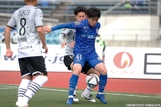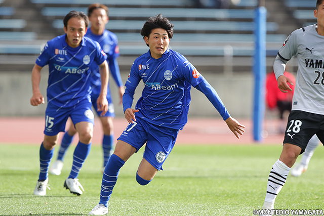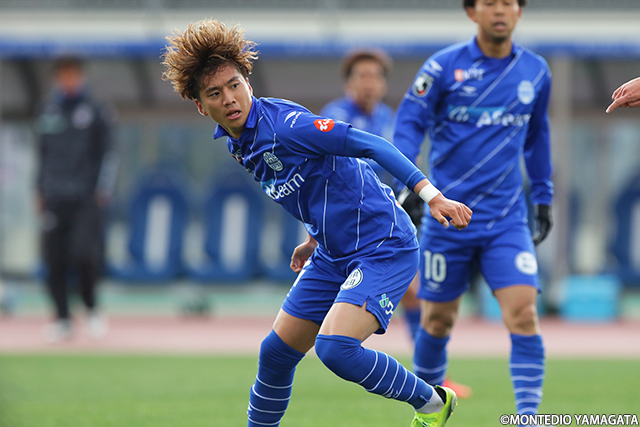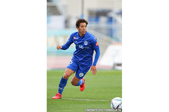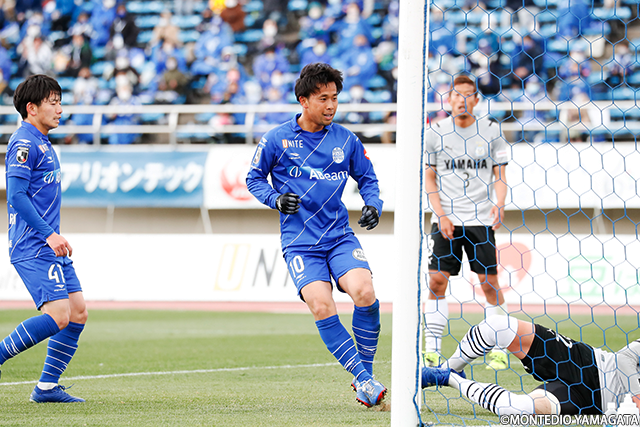 モンテディオは右サイドの中原選手が何度か仕掛けに関わりながらフィニッシュまで持ち込めずにいたが、34分、相手のパスミスを中央で受けた南選手が、左サイドの國分選手にボールを送ると、クロスに対してニアに入った南選手は触ると見せかけてスルー。相手キーパーがキャッチしきれずファーサイドへ流れたボールを、詰めていた中村充孝選手が押し込み、モンテディオが先制した。