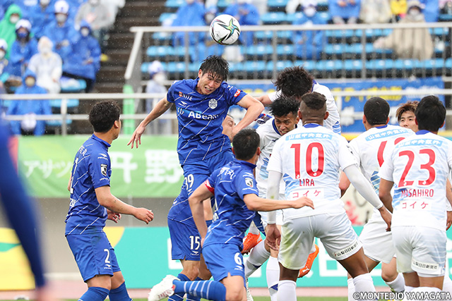 守備でもハイプレスで甲府の攻撃を封じていたモンテディオはFKを獲得。15分、距離のあるそのFKでキッカー・中原選手がファーサイドへ送ると、野田裕喜選手の折り返しを藤田息吹選手がヘディングシュート。藤田選手の2試合連続ゴールが決まり、モンテディオが先制した。