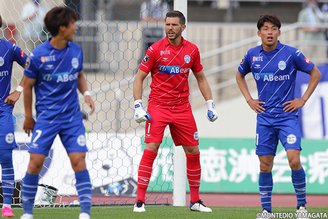 しかし、ここでモンテディオにアクシデント。48分、ビルドアップの際に相手と接触したGK藤嶋栄介選手が右膝を痛め、メディカルスタッフのチェック後、一旦プレーに戻ったが、58分に藤嶋選手から続行不可の合図があり、60分にビクトル選手と交代することになった。