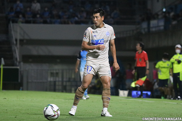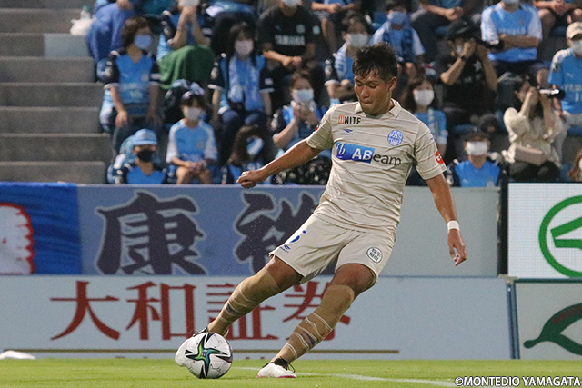 危ない場面は作られていないものの、自陣で守備をする時間が長く続いていたモンテディオは、37分、ビルドアップでボールがつながり、久しぶりに相手陣内に入っていくと、半田選手のくさびを林選手がフリックし、3人目でボールを受けた中原選手が中央まで持ち込んで左足を振り抜くと、ファーポストの内側をかすめてゴールマウスにシュートが飛び込んだ。