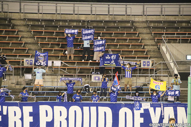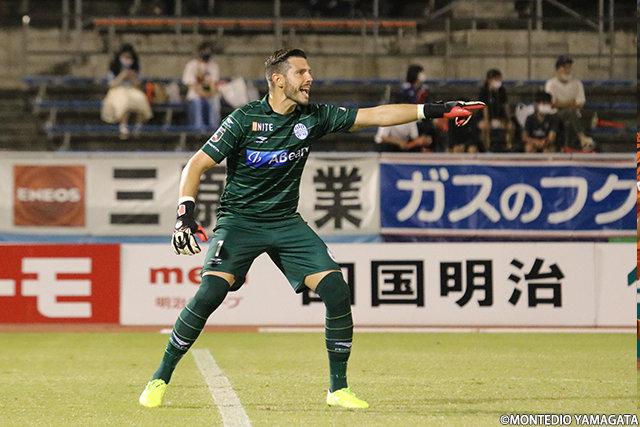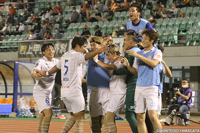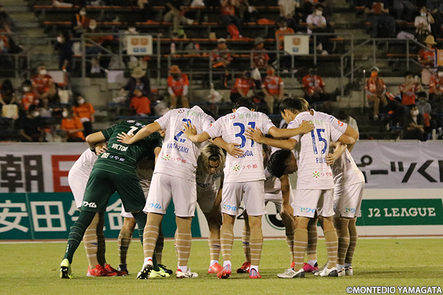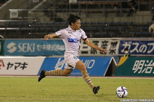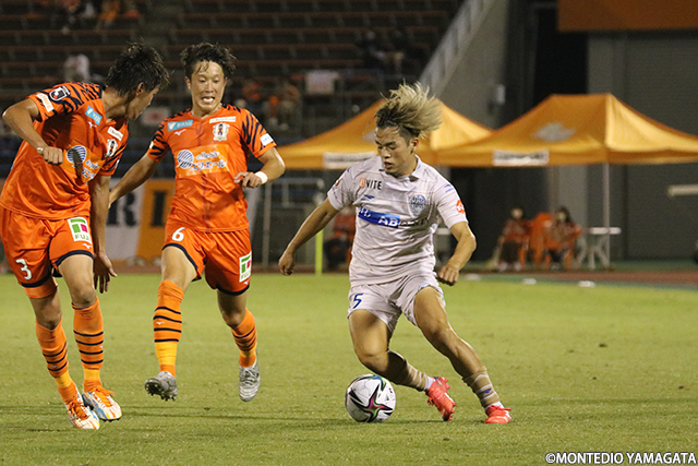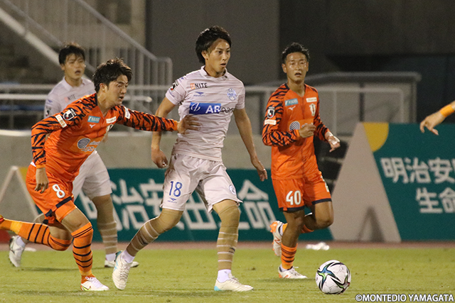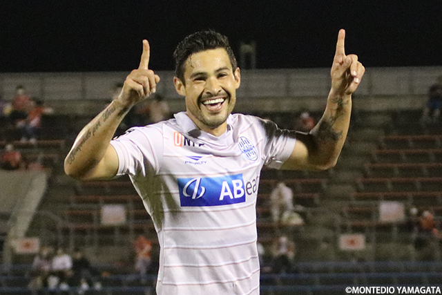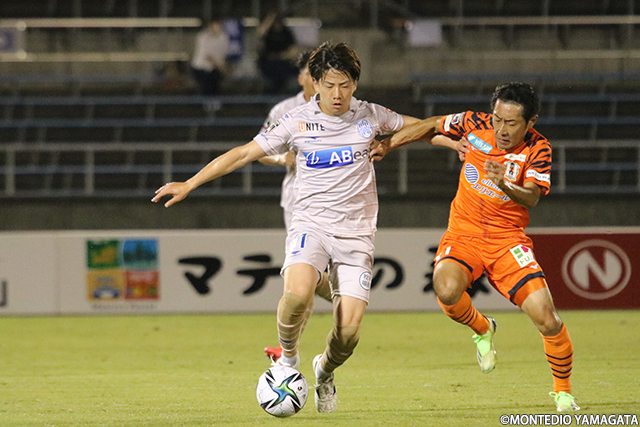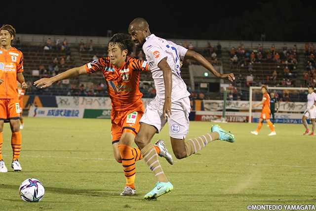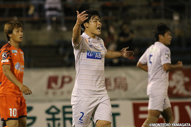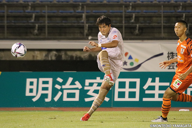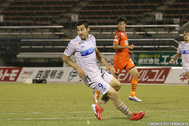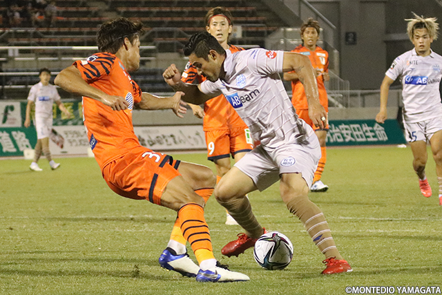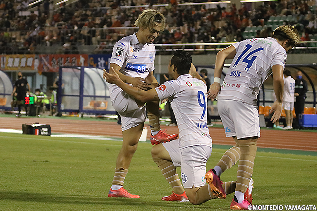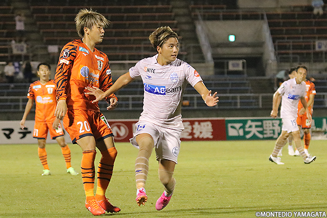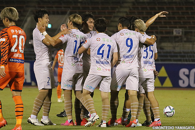 2連敗で迎えたアウェイの第31節・愛媛FC戦、モンテディオ山形は山田康太選手、ヴィニシウス アラウージョ選手が2得点ずつを挙げ、守っても愛媛の攻撃をシャットアウト。4-0で3試合ぶりの勝利を飾った。