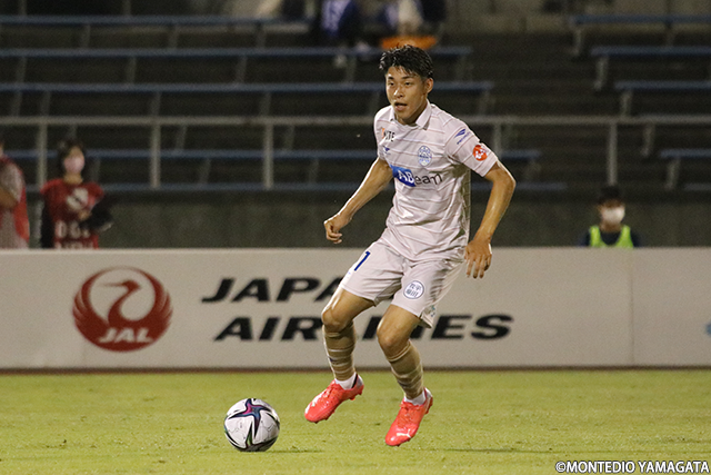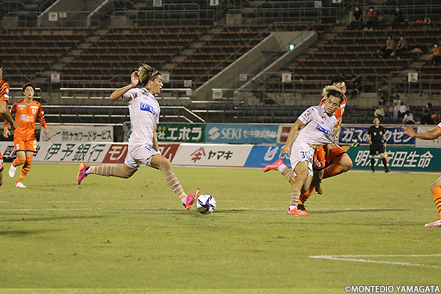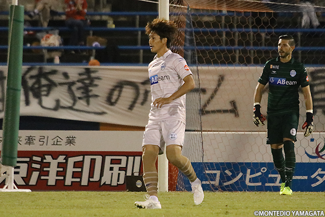 すると18分、山﨑浩介選手から縦へ長いスルーパスが送られると、これをペナルティーエリア内でヴィニシウス選手が収め、そこからパスを受けた山田康太選手が左足でシュートを放ち、先制に成功した。これまで6試合連続で前半に先制されていたモンテディオは、ついに念願の先制点を手にした。
