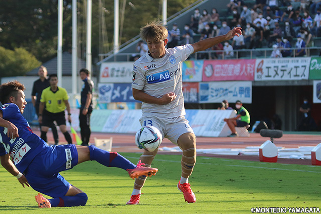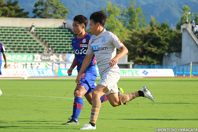 4-0と勝利した前節・愛媛戦と同じメンバーで臨んだモンテディオは、立ち上がりからボールを握り、相手を動かしながらスペースを突いていった。4分には右のニアゾーンを取った中原輝選手のマイナスの折り返しを藤田息吹選手がシュート。6分にもカウンターで中原選手がドリブルで持ち上がり、スルーパスを引き出した山田康太選手が2度切り返してからシュートを放ったが、枠内に向かったように見えたボールは惜しくもポストに跳ね返った。