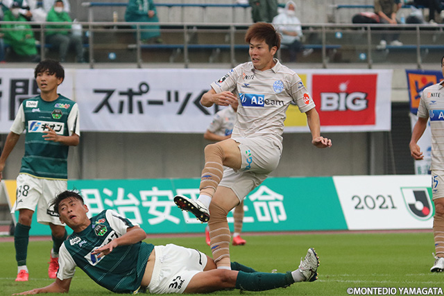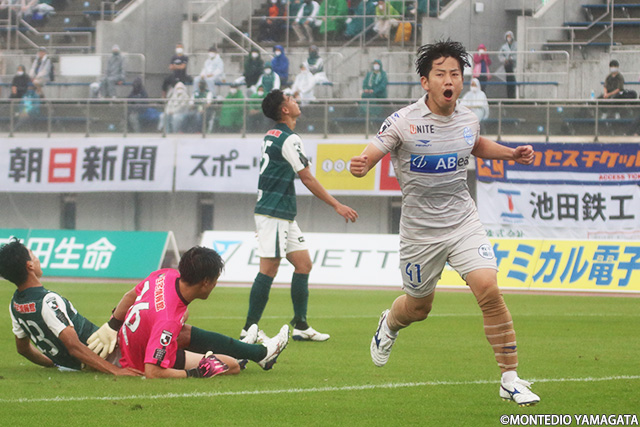 モンテディオ山形はアウェイでSC相模原戦と対戦。前半終了間際に2試合連続ゴールで先制すると、この1点のリードを最後まで保ち、1-0。ピーター クラモフスキー監督の43歳のバースデーを10試合ぶりの連勝で祝った。