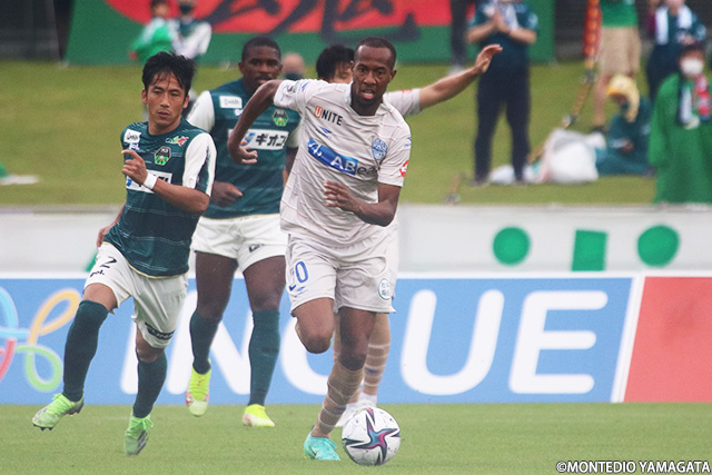 その直後にはスローインの流れから安藤選手にシュートを打たれたが、アディッショナルタイム直前の45分、ゴールキックから相手の圧力を受けながらつなぎ、山田康太選手から樺山選手につないだことで押し込んだ形を作ったモンテディオは、右サイドから中原選手が樺山選手とのワンツーで中央に入り込み、続いてヴィニシウス選手とのワンツーでラインを中央から突破。キーパーとの1対1も落ち着いて決めきり、先制に成功した。