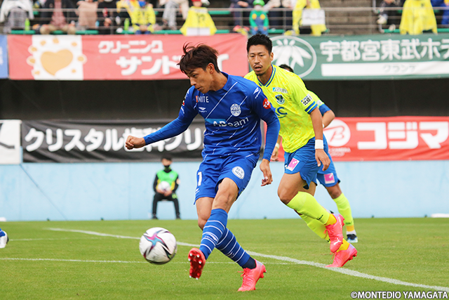 しかし、攻め込みながらもゴール前では栃木のタイトな守備に阻まれ、なかなかゴールを割ることができなかった。34分にはヴィニシウス選手に絡んでゴール前に入っていった半田選手がシュートを放ったが、これはサイドネット。41分にはインナーラップで深い位置を取った山田拓巳選手のクロスから、藤田選手がシュート、こぼれ球を中原選手がセットして今度は山田康太選手がシュートを狙ったが、いずれも防がれた。