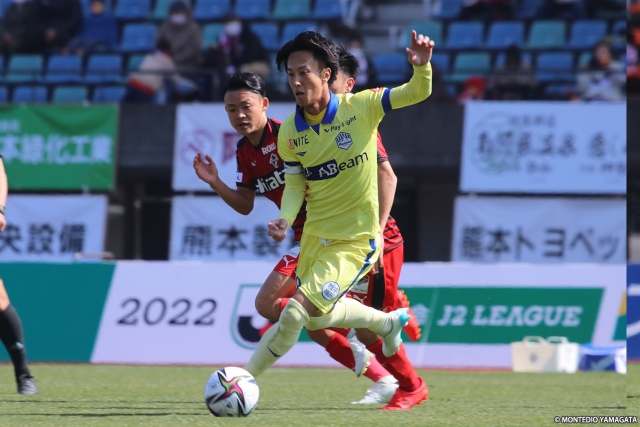 モンテディオは立ち上がりから、前から守備に来る相手の背後にロングボールを送った。開始直後、熊本のFKをGK後藤雅明選手がキャッチし、吉田朋恭選手の縦へのフィードで藤本選手を走らせると、4分には山﨑浩介選手のフィードを右サイドで横山塁選手が受けてクロス。6分にも山﨑選手から藤本選手へロングボールが通ったが、クロスが合わなかった。