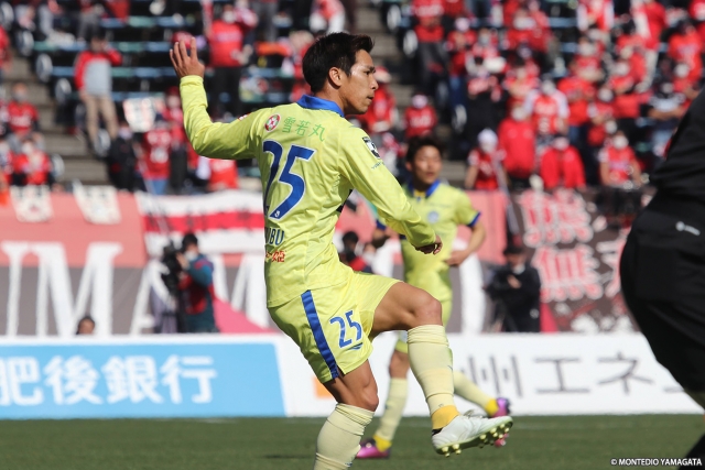 熊本もロングボールを使い、序盤のせめぎ合いが続いたが、9分、相手のクリアミスを収めた藤本選手がそのまま持ち運び、中央へクロス。これを加藤選手が右足で冷静に合わせ、チームの今季ファーストゴールを決めた。