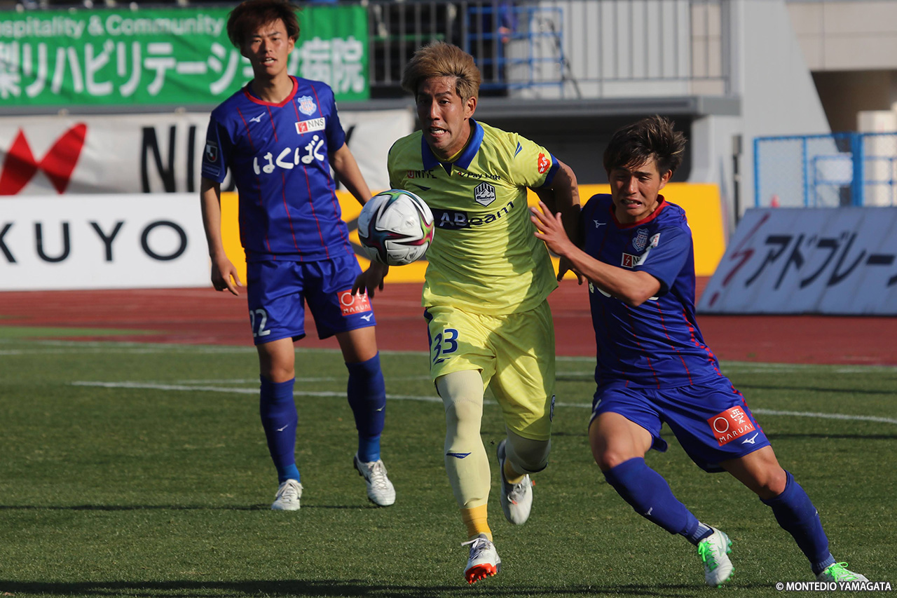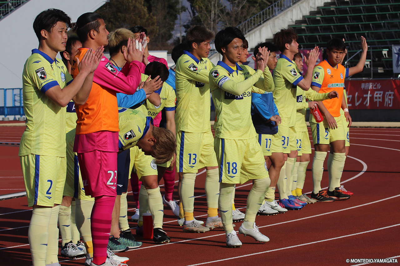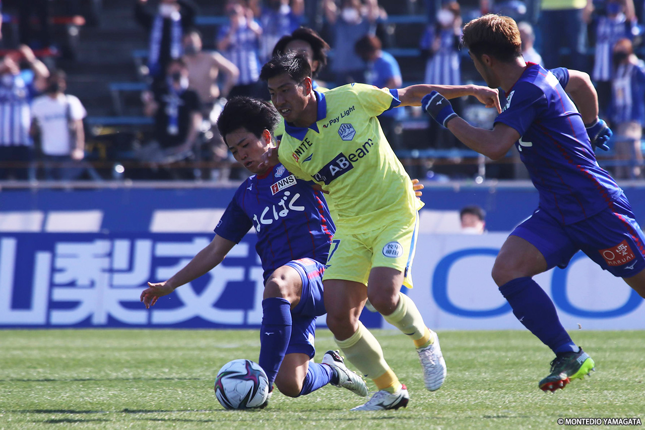 終盤には甲府も攻め急ぎでパスがつながらないシーンが増え、5分目安のアディショナルタイム突入直後に与えたFKでも、ファーサイドで合わせられたもののシュートは枠をそれ、モンテディオがしのいでいる。