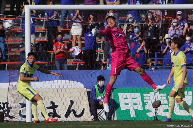 51分にはクロスから甲府・三平和司選手に立て続けにシュートを狙われたり、63分にはCKから松本凪生選手にシュートを打たれ、後藤選手が必死のセーブで防ぐシーンもあった。さらに甲府が2枚替え直後の65分、クロスから長谷川元希選手にシュートを打たれるなど、前半には打たせなかったシュートを許すシーンも増えていた。