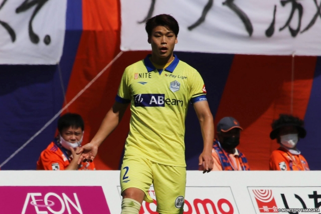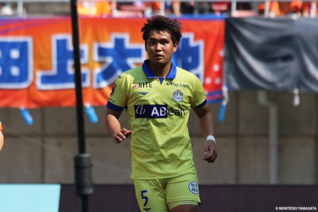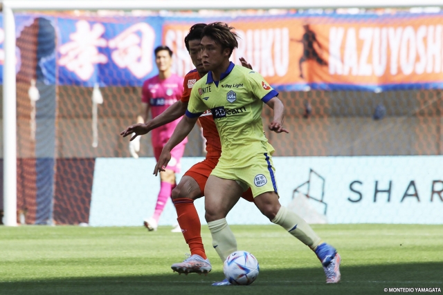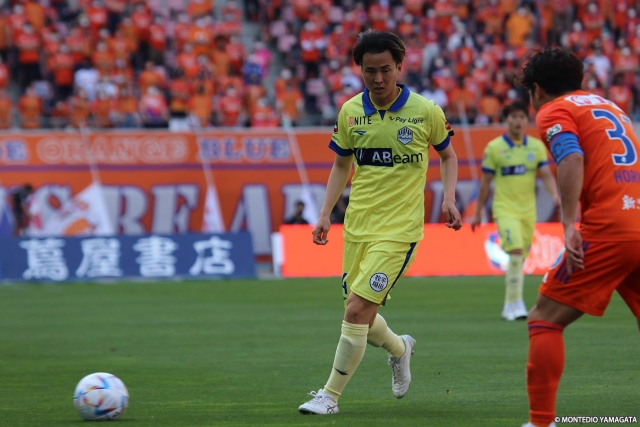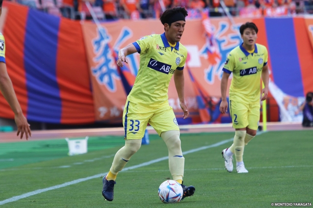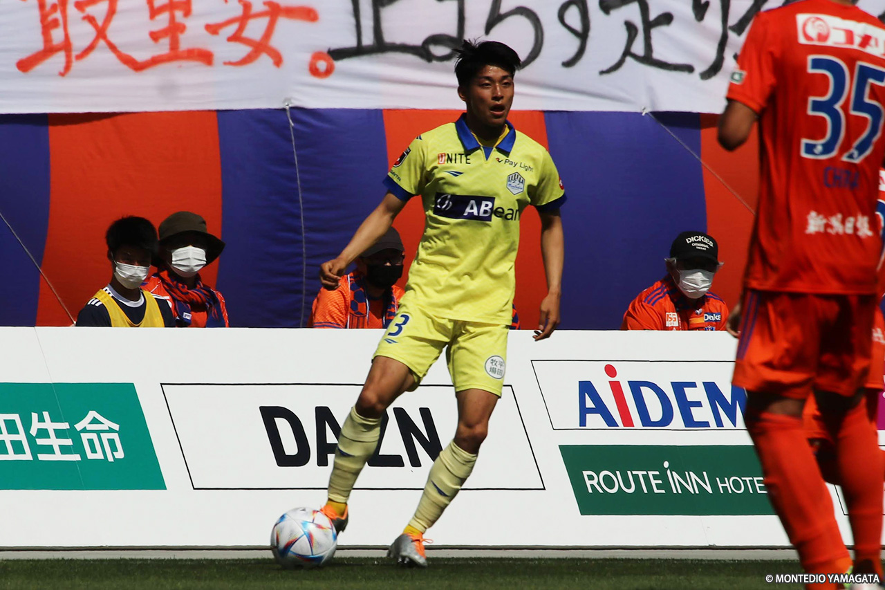 22分には加藤大樹選手の技ありのスライディングタックルから攻撃をつなげ、河合選手がミドルシュートを放った。その後も河合選手が中盤で豊富な運動量を生かしながらボールをさばいたり、野田選手が左右に長いボールを飛ばしたり、主導権はモンテディオが握っていた。