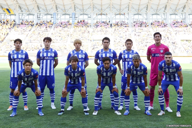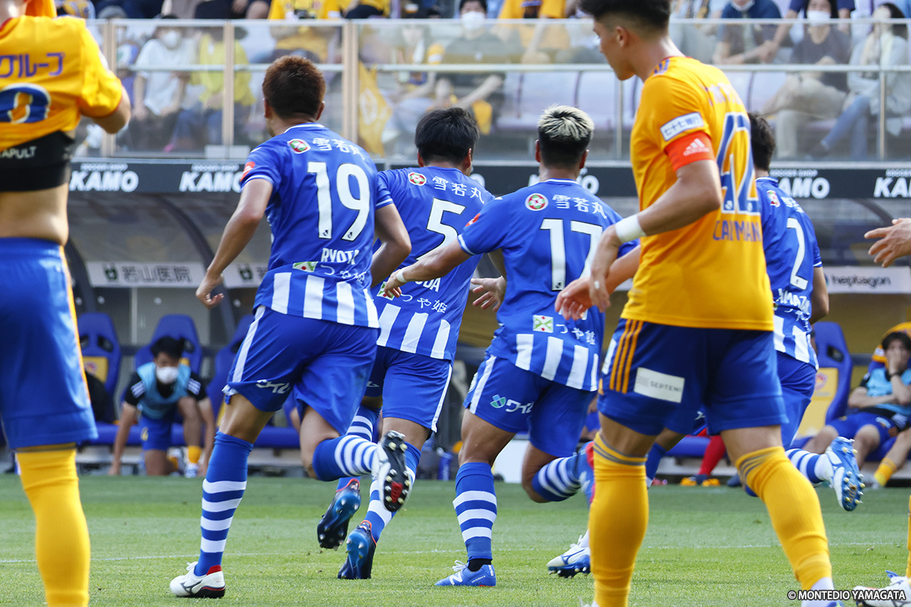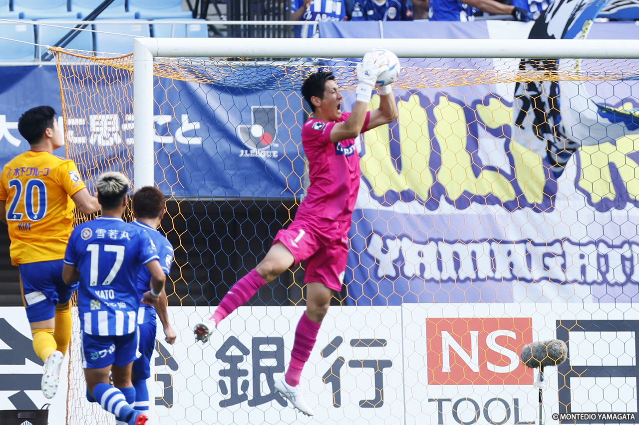モンテディオは何度かサイドを突破され、クロスを入れられるが、ゴール前ではセンターバックの2人を中心に跳ね返し、24分、ラインを突破され背後へ抜け出されたシーンでも相手のパスミスでピンチを防ぐことができた。