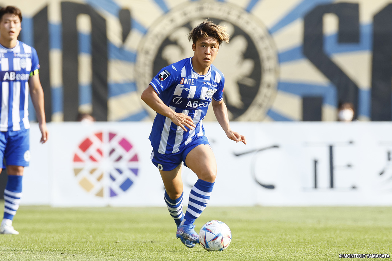 暑さもあり、互いに失点を警戒してそれほどリスクを冒さない試合展開となったが、33分、相手コートからのFKで、國分選手が蹴ったボールを野田裕喜選手が鮮やかなボレーシュート。キーパーが対応できないコースに決まり、モンテディオが先制に成功した。