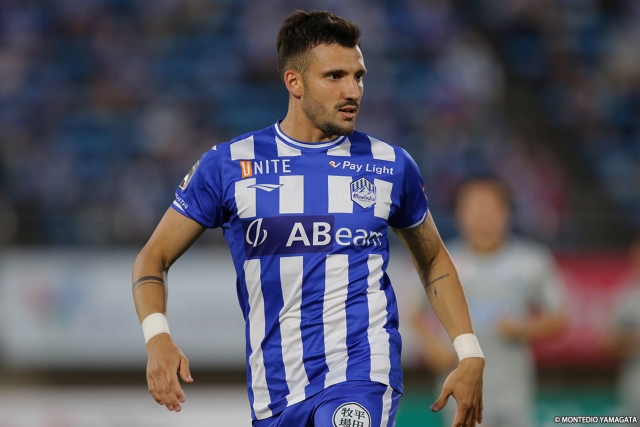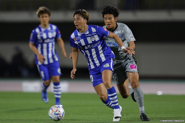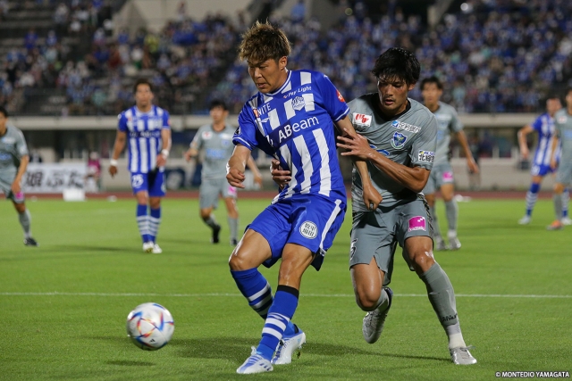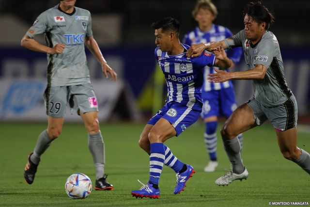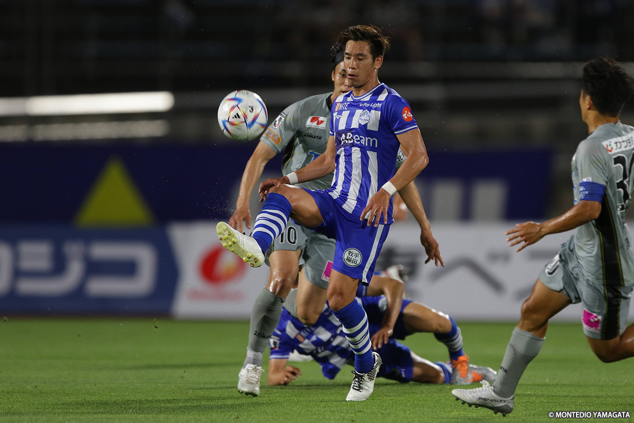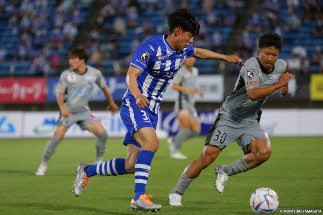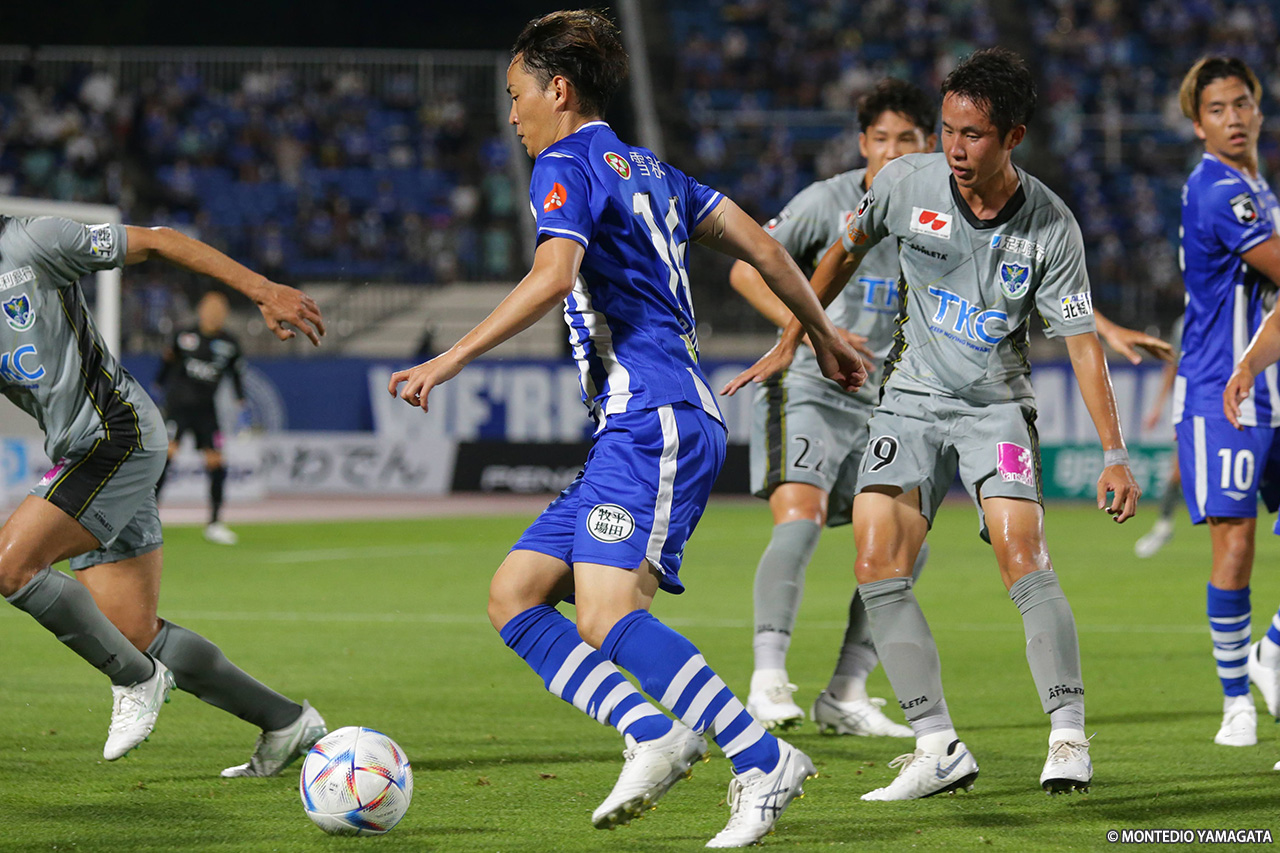 61分、山形は3枚替え。藤原選手、加藤選手、河合選手に代えて鈴木国友選手、藤田息吹選手、山田康太選手が投入された。その直後の62分には、鈴木選手の左からのクロスをキーパーが前に弾いたところを藤田選手が飛び込んでシュートまで持ち込んだが、ゴール前に戻っていた選手にクリアされ、ゴールはならなかった。