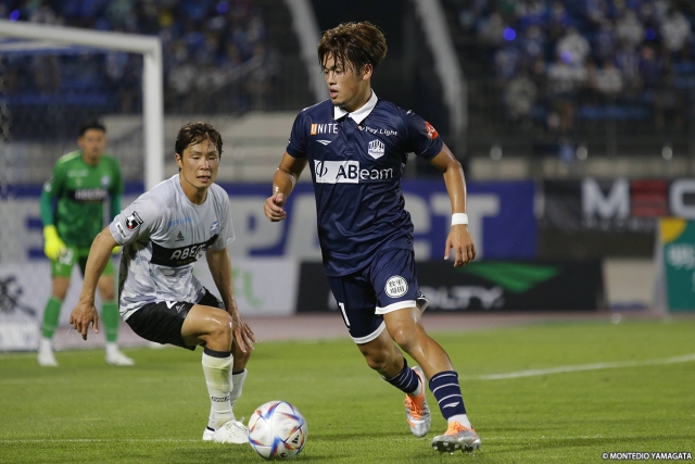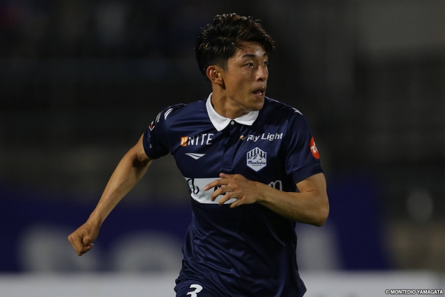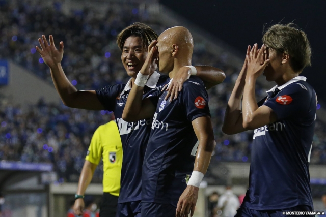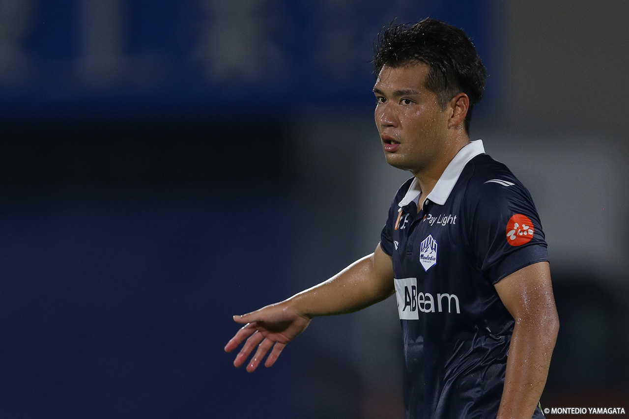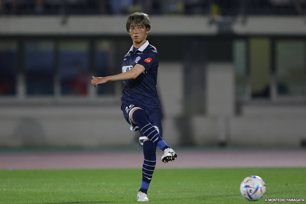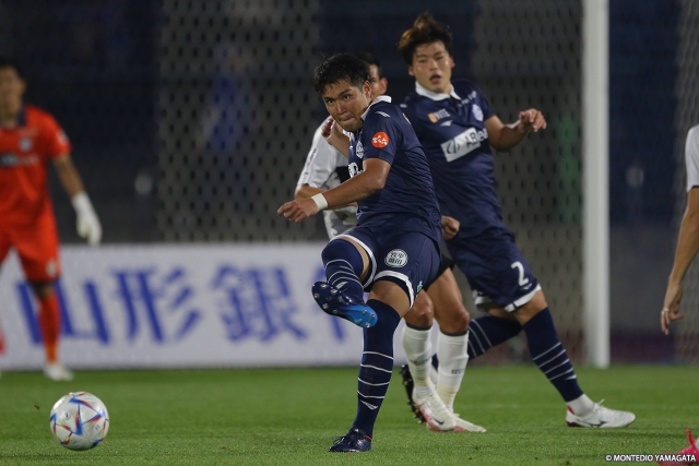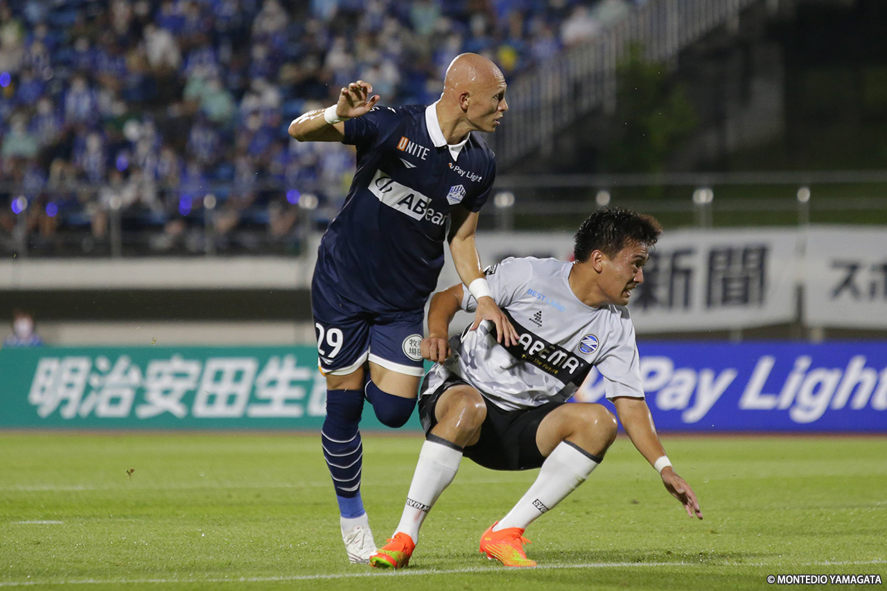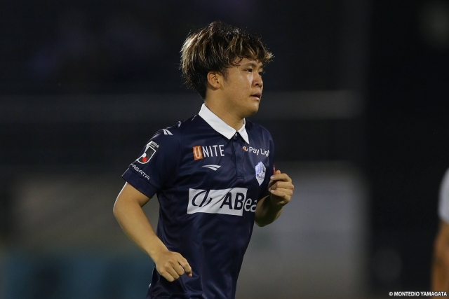 Q1:山形での初ゴールおめでとうございます1回ボールが右に行って、ワンテンポ置いてからのクロスでしたが、どういった動きを狙いとしてしましたか?自分が1回起点になって、ターンして、一発でシンくん(國分伸太郎)にゴール決めさせるスルーパス出したかったんですけど、若干ズレちゃって、それでもシンくんが粘ってくれたので、チームの決まり事じゃないですけど、キーパーとディフェンスの間に走り込むというのがストライカーの役目なので、1回あそこで関わることで僕のマークも1回外れますし、一瞬いなくなったときに相手がつかめないタイミングで、あそこに全力で入っていけたのはよかったです。実際、スライディングでカバーも来ていたんですけど、それも見えていたので、1個遅らせて、スライディングで滑った後ろ側から決められたのかなと思います。