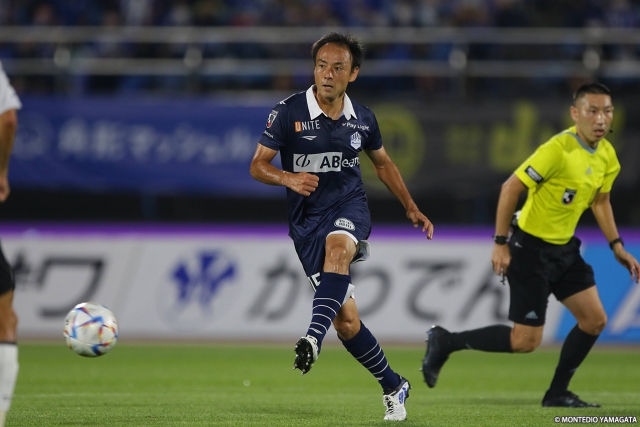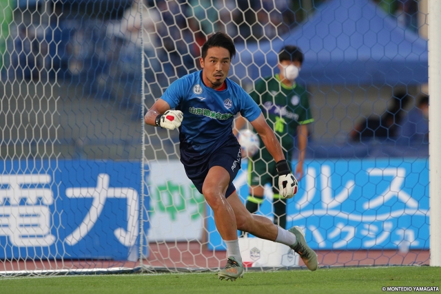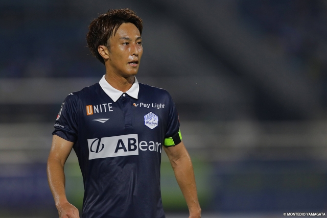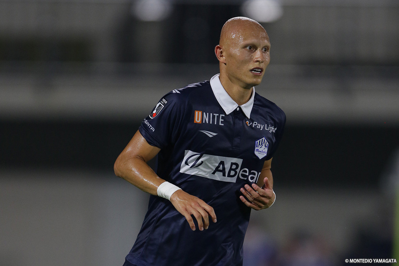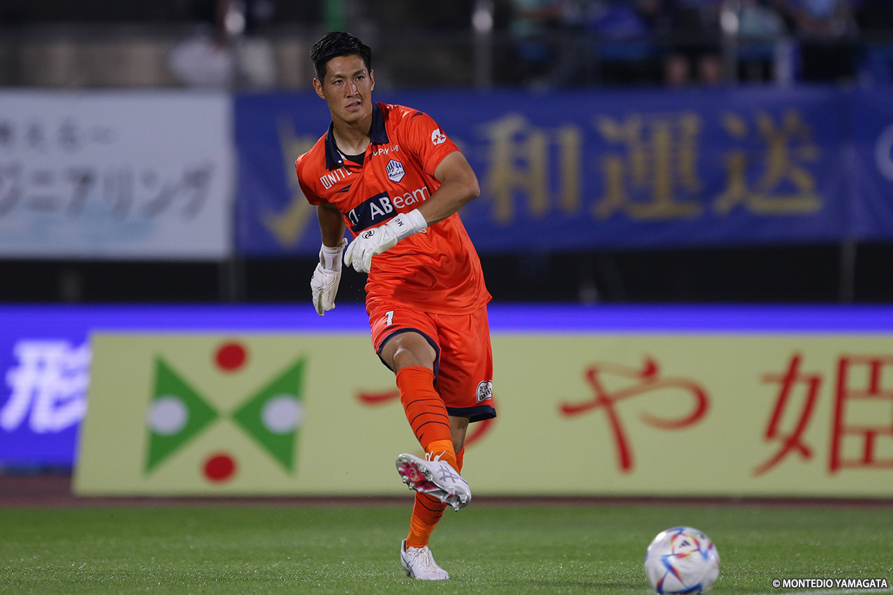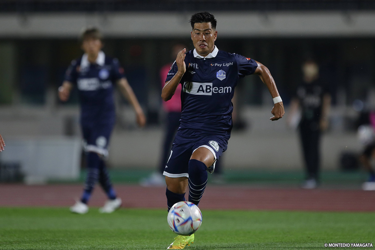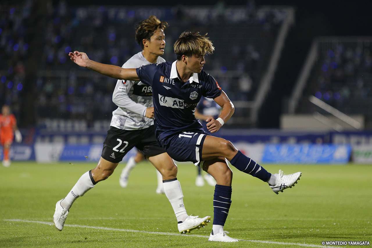 Q1:山形での初ゴールおめでとうございます1回ボールが右に行って、ワンテンポ置いてからのクロスでしたが、どういった動きを狙いとしてしましたか?自分が1回起点になって、ターンして、一発でシンくん(國分伸太郎)にゴール決めさせるスルーパス出したかったんですけど、若干ズレちゃって、それでもシンくんが粘ってくれたので、チームの決まり事じゃないですけど、キーパーとディフェンスの間に走り込むというのがストライカーの役目なので、1回あそこで関わることで僕のマークも1回外れますし、一瞬いなくなったときに相手がつかめないタイミングで、あそこに全力で入っていけたのはよかったです。実際、スライディングでカバーも来ていたんですけど、それも見えていたので、1個遅らせて、スライディングで滑った後ろ側から決められたのかなと思います。